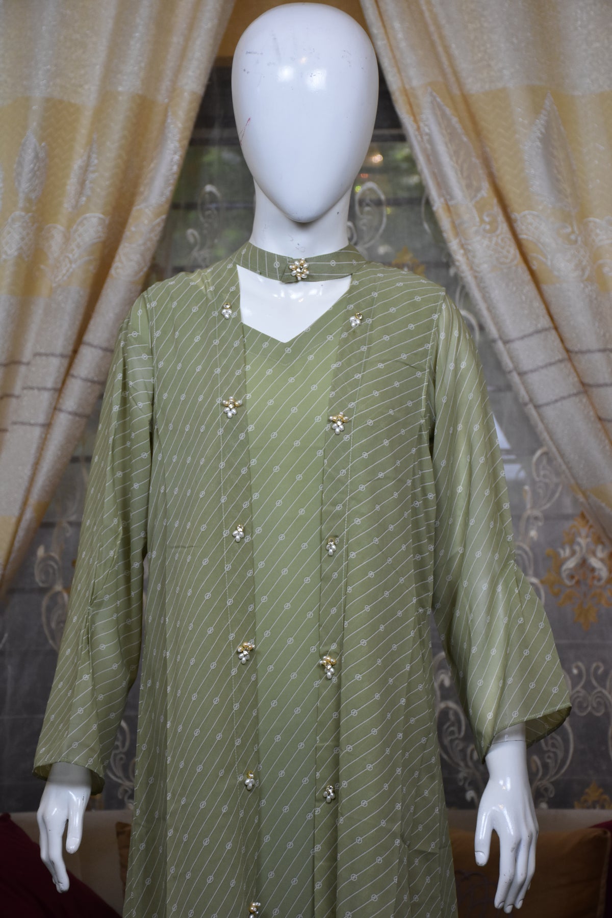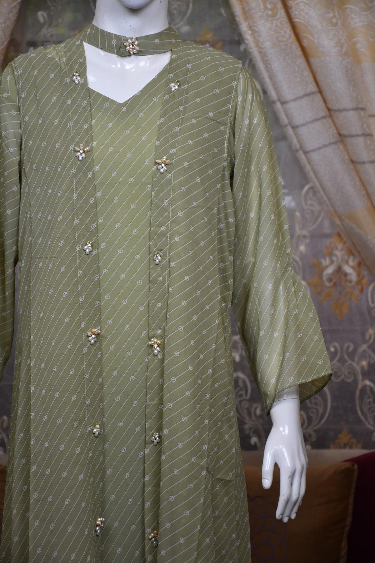 Front open 3 pc Chiffon Gown dress. Inner shirt and upper gown are separate. Lining in the inner and trouser. Silver and golden pearl buttons. Comes in elegant designs