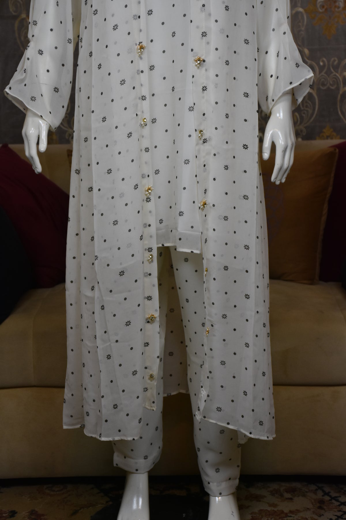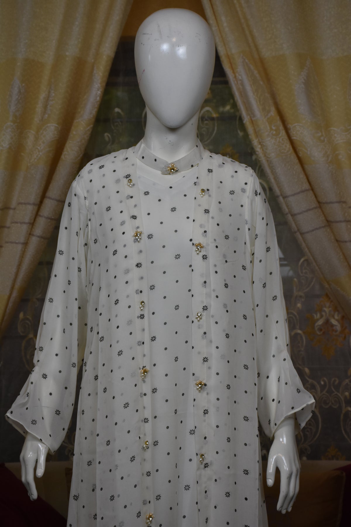 Front open 3 pc Chiffon Gown dress. Inner shirt and upper gown are separate. Lining in the inner and trouser. Silver and golden pearl buttons. Comes in elegant designs