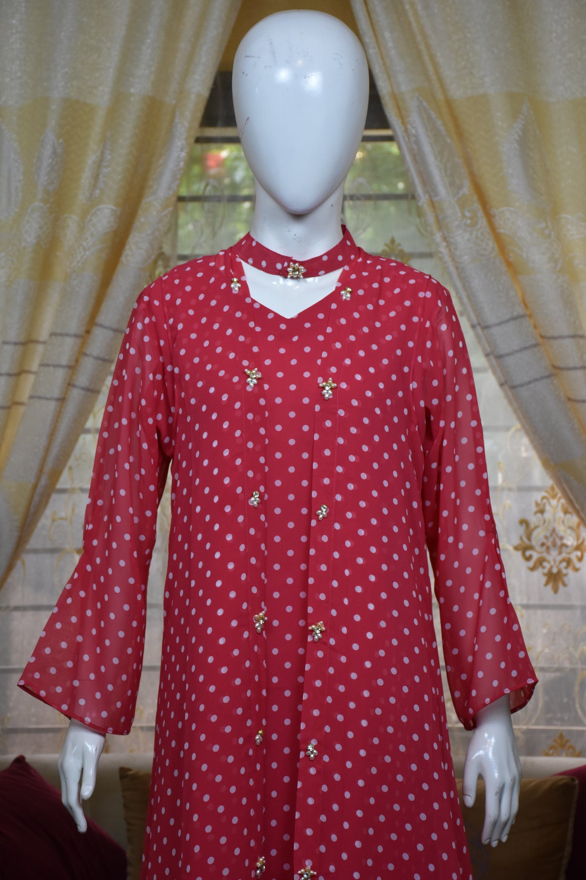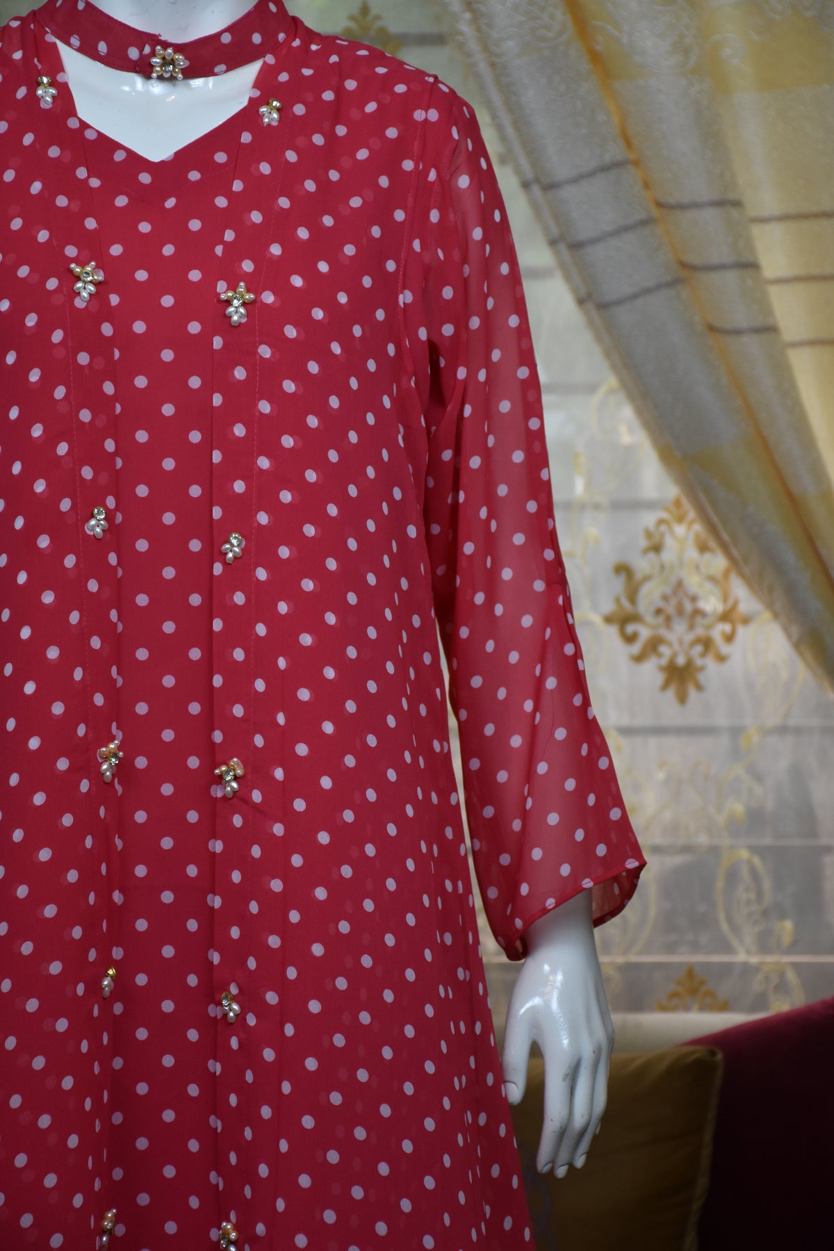 Front open 3 pc Chiffon Gown dress. Inner shirt and upper gown are separate. Lining in the inner and trouser. Silver and golden pearl buttons. Comes in elegant designs