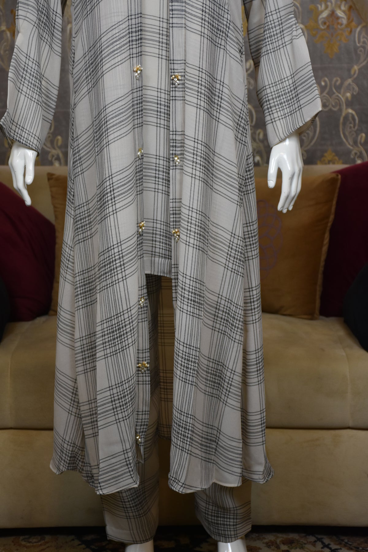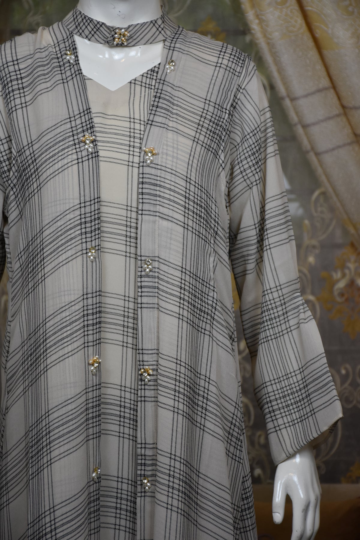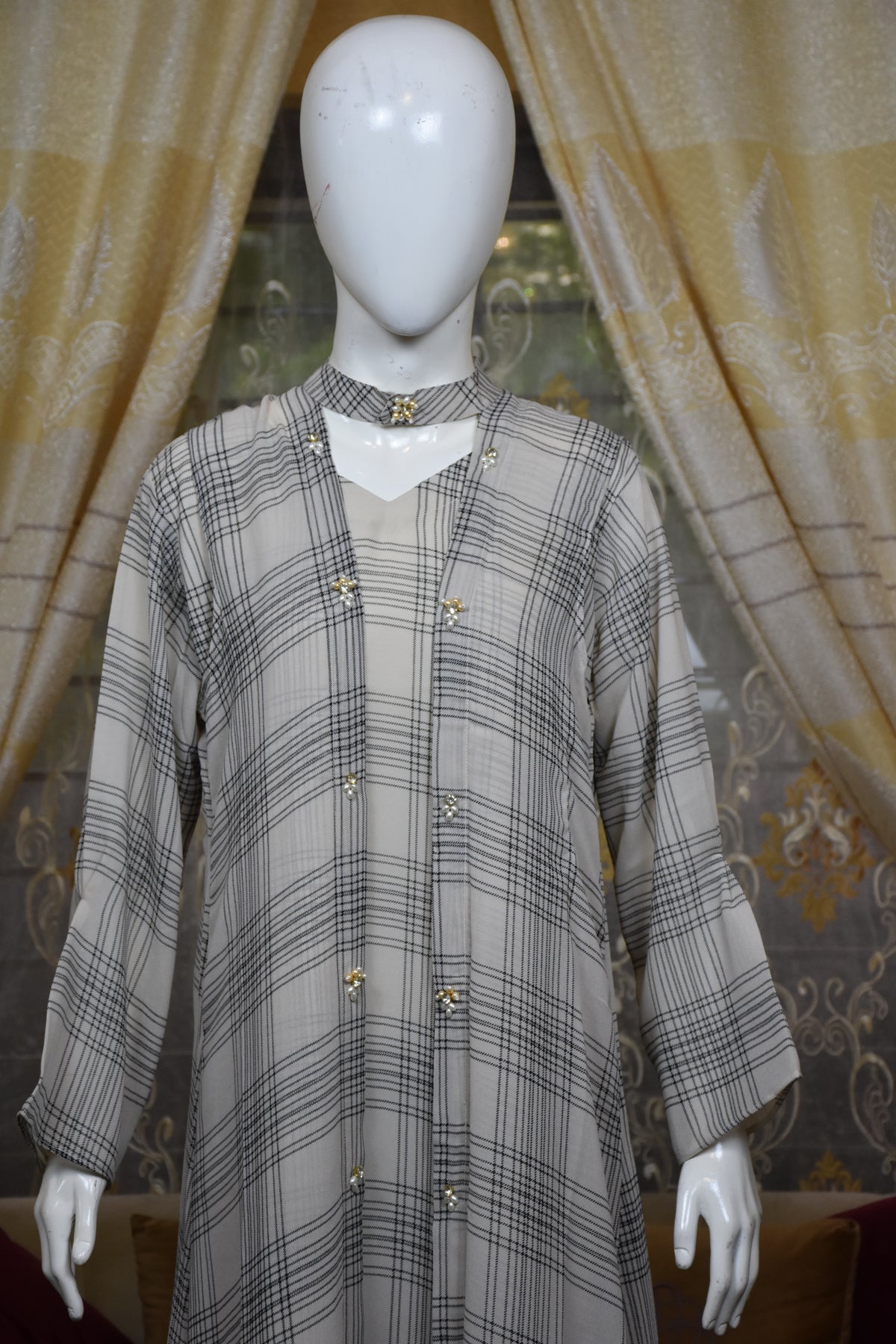 Front open 3 pc Chiffon Gown dress. Inner shirt and upper gown are separate. Lining in the inner and trouser. Silver and golden pearl buttons. Comes in elegant designs